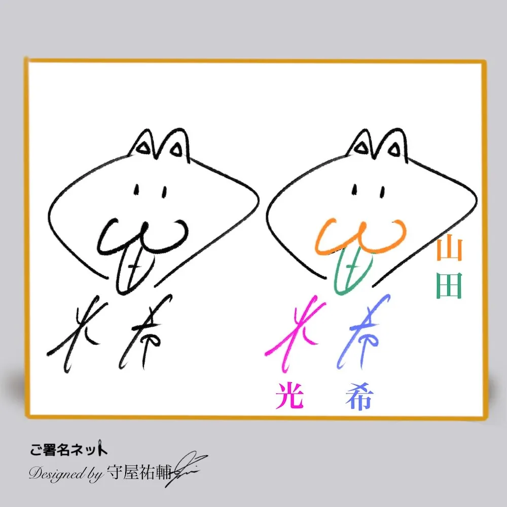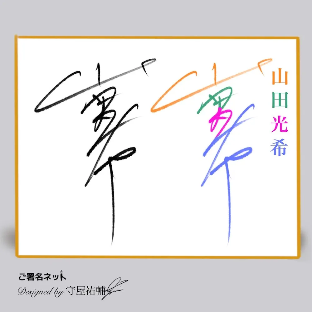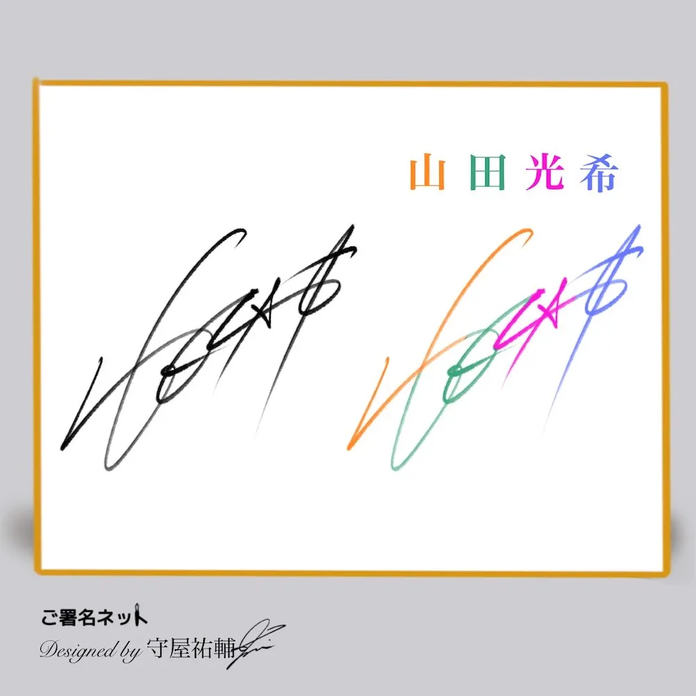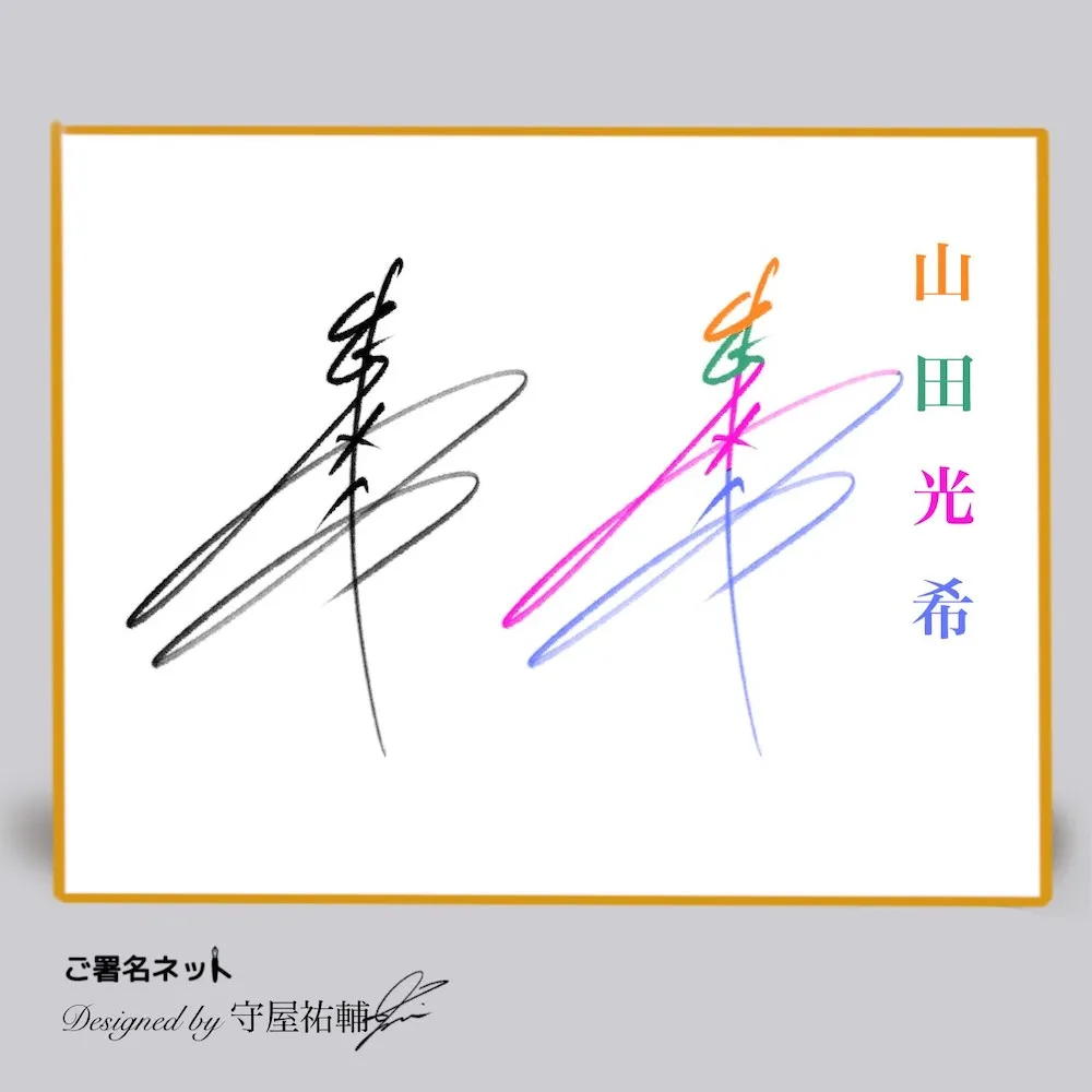 ↑ こちらのサインは光希の横線を長く強調した縦書きサインです。広いサイン色紙だからこそ使えるテクニックで、紙面を広く使います。お名前の漢字に横線が多い人はそれを長く強調させるとインパクトのあるデザインに仕上がりやすいですね。